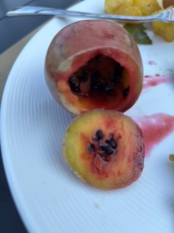 At breakfast, I tried a tree tomato for the first time—vibrant, tangy, delicious. You can suck the insides straight out or use a spoon like I did. Then we set off by boat across the lake to explore the hillside beyond. The water was smooth and cool, the boat gliding past birds and distant islands like a dream.